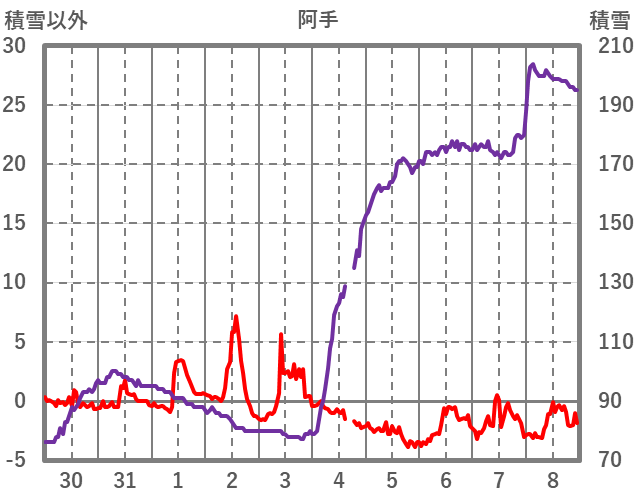 | 日 | 時 | 気温 | 降水 | 風向/風速 | 日照 | 積雪 | 降雪 |
