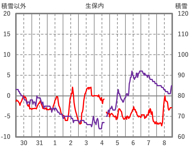 | 日 | 時 | 気温 | 降水 | 風向/風速 | 日照 | 積雪 | 降雪 |