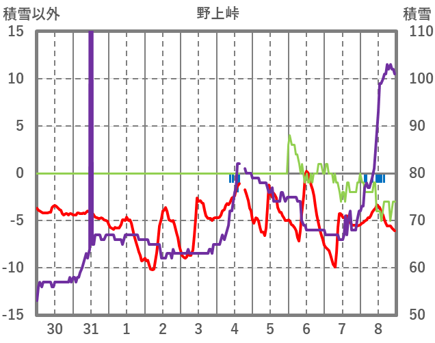| 日 | 時 | 気温 | 降水 | 風向/風速 | 日照 | 積雪 | 降雪 |