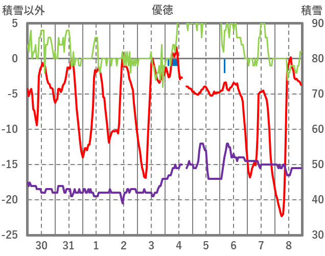 | 日 | 時 | 気温 | 降水 | 風向/風速 | 日照 | 積雪 | 降雪 |