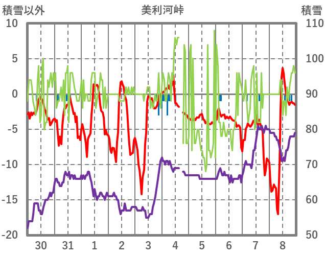 | 日 | 時 | 気温 | 降水 | 風向/風速 | 日照 | 積雪 | 降雪 |