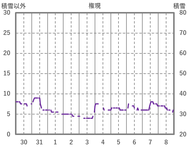 | 日 | 時 | 気温 | 降水 | 風向/風速 | 日照 | 積雪 | 降雪 |