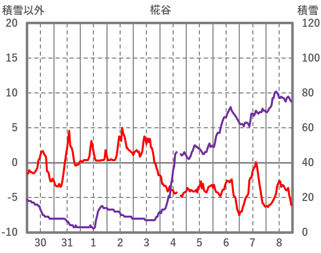 | 日 | 時 | 気温 | 降水 | 風向/風速 | 日照 | 積雪 | 降雪 |