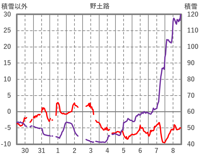 | 日 | 時 | 気温 | 降水 | 風向/風速 | 日照 | 積雪 | 降雪 |