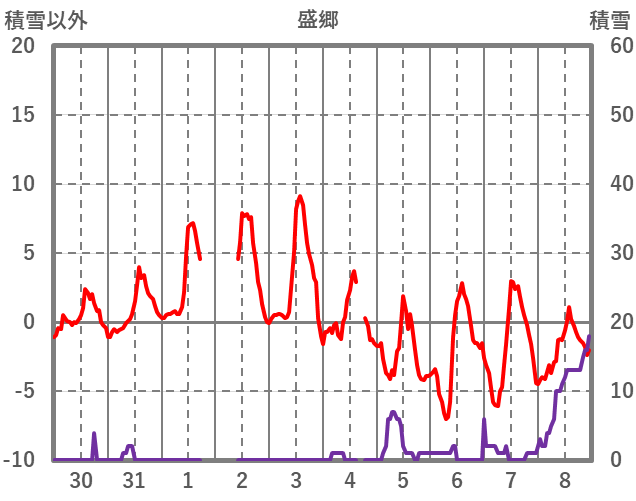 | 日 | 時 | 気温 | 降水 | 風向/風速 | 日照 | 積雪 | 降雪 |