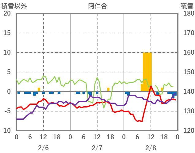 | 日 | 時 | 気温 | 降水 | 風向/風速 | 日照 | 積雪 | 降雪 |