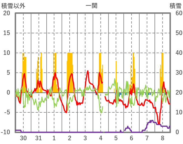 | 日 | 時 | 気温 | 降水 | 風向/風速 | 日照 | 積雪 | 降雪 |