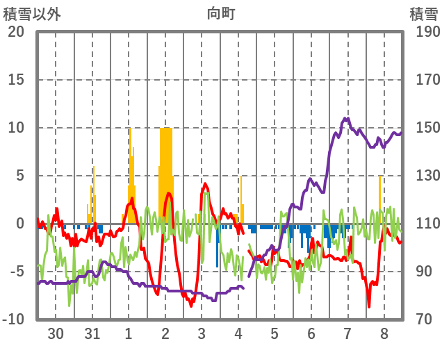 | 日 | 時 | 気温 | 降水 | 風向/風速 | 日照 | 積雪 | 降雪 |