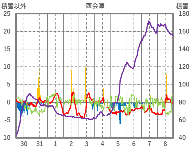 | 日 | 時 | 気温 | 降水 | 風向/風速 | 日照 | 積雪 | 降雪 |