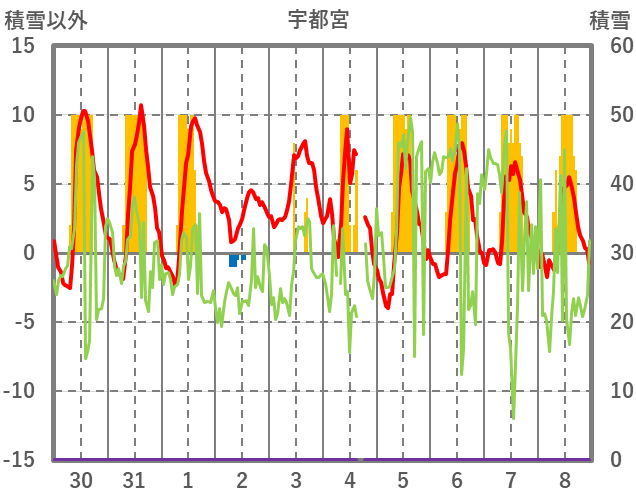 | 日 | 時 | 気温 | 降水 | 風向/風速 | 日照 | 積雪 | 降雪 |