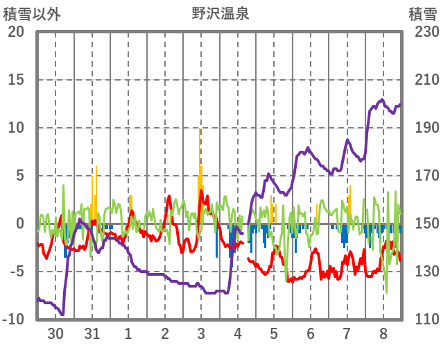 | 日 | 時 | 気温 | 降水 | 風向/風速 | 日照 | 積雪 | 降雪 |