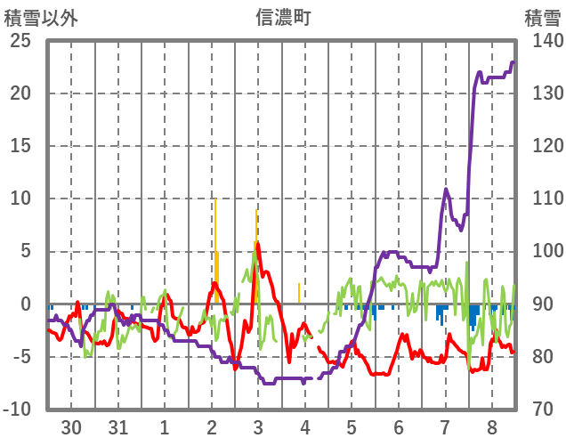 | 日 | 時 | 気温 | 降水 | 風向/風速 | 日照 | 積雪 | 降雪 |
