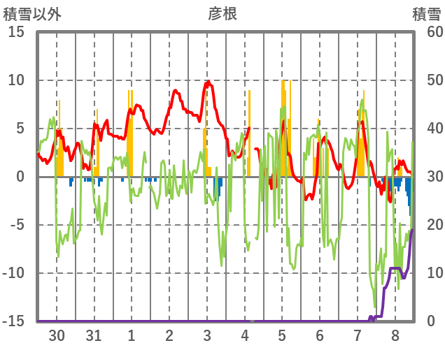 | 日 | 時 | 気温 | 降水 | 風向/風速 | 日照 | 積雪 | 降雪 |