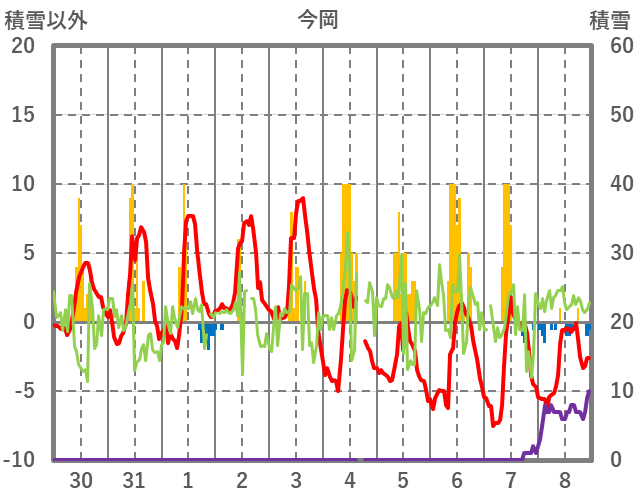 | 日 | 時 | 気温 | 降水 | 風向/風速 | 日照 | 積雪 | 降雪 |