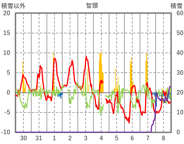 | 日 | 時 | 気温 | 降水 | 風向/風速 | 日照 | 積雪 | 降雪 |