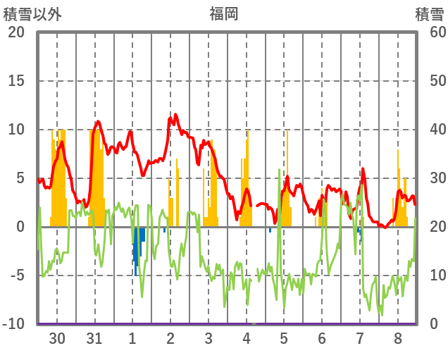 | 日 | 時 | 気温 | 降水 | 風向/風速 | 日照 | 積雪 | 降雪 |