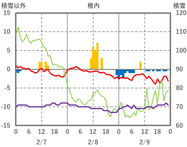 | 日 | 時 | 気温 | 降水 | 風向/風速 | 日照 | 積雪 | 降雪 |