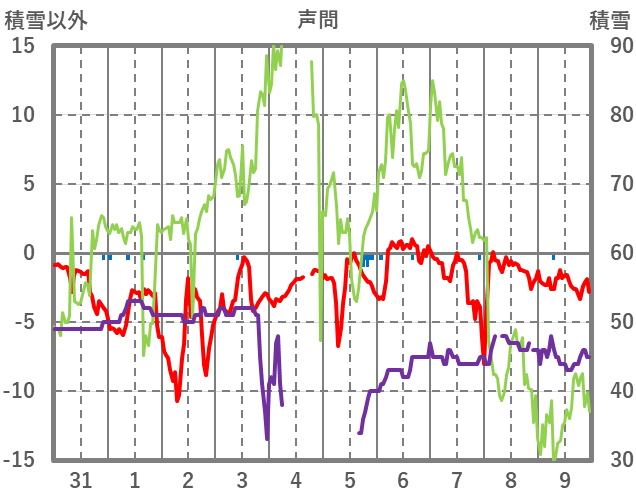 | 日 | 時 | 気温 | 降水 | 風向/風速 | 日照 | 積雪 | 降雪 |