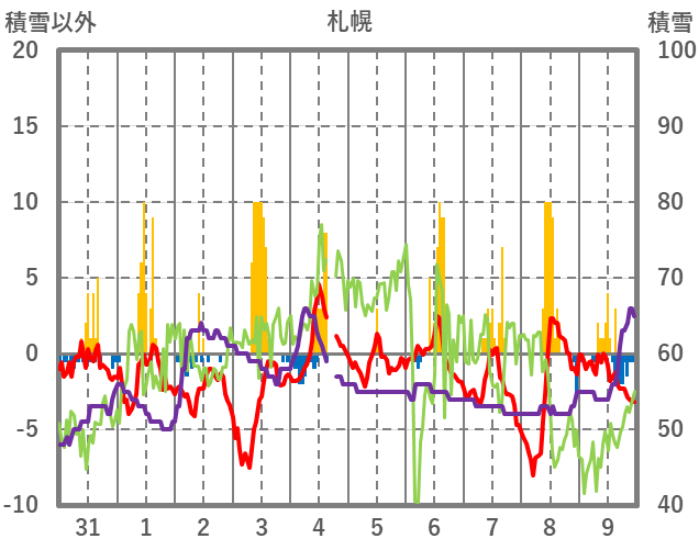 | 日 | 時 | 気温 | 降水 | 風向/風速 | 日照 | 積雪 | 降雪 |