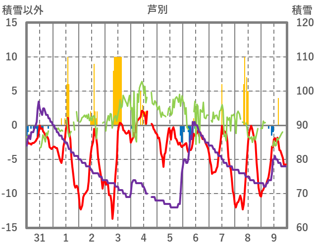 | 日 | 時 | 気温 | 降水 | 風向/風速 | 日照 | 積雪 | 降雪 |