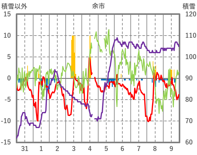 | 日 | 時 | 気温 | 降水 | 風向/風速 | 日照 | 積雪 | 降雪 |