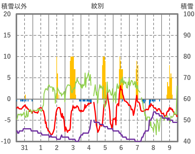 | 日 | 時 | 気温 | 降水 | 風向/風速 | 日照 | 積雪 | 降雪 |