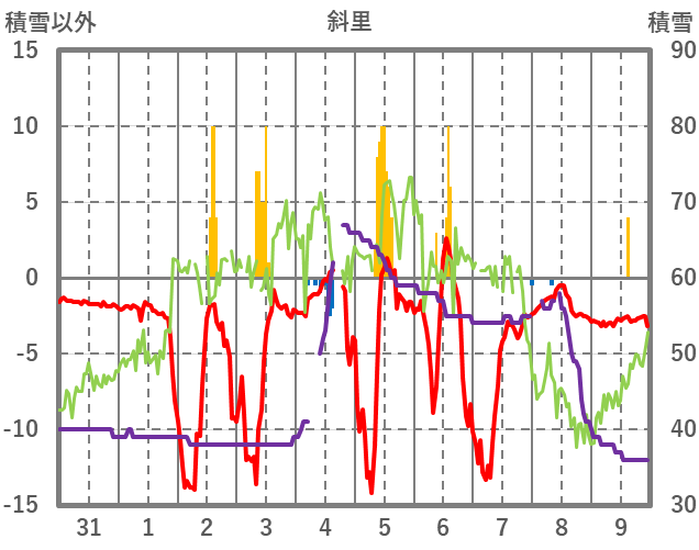 | 日 | 時 | 気温 | 降水 | 風向/風速 | 日照 | 積雪 | 降雪 |