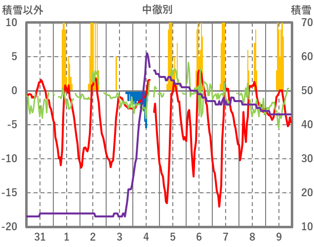 | 日 | 時 | 気温 | 降水 | 風向/風速 | 日照 | 積雪 | 降雪 |