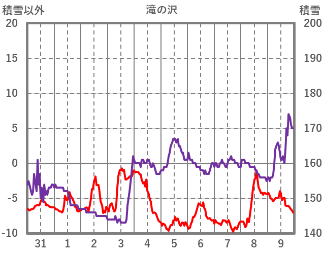 | 日 | 時 | 気温 | 降水 | 風向/風速 | 日照 | 積雪 | 降雪 |
