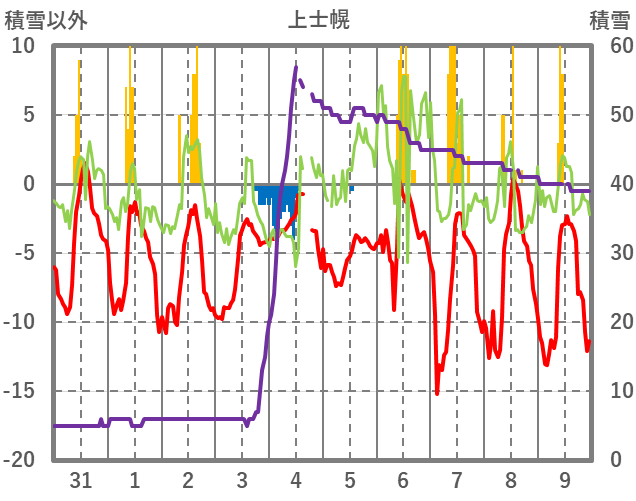 | 日 | 時 | 気温 | 降水 | 風向/風速 | 日照 | 積雪 | 降雪 |