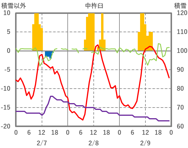| 日 | 時 | 気温 | 降水 | 風向/風速 | 日照 | 積雪 | 降雪 |