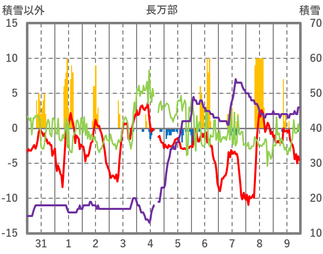 | 日 | 時 | 気温 | 降水 | 風向/風速 | 日照 | 積雪 | 降雪 |