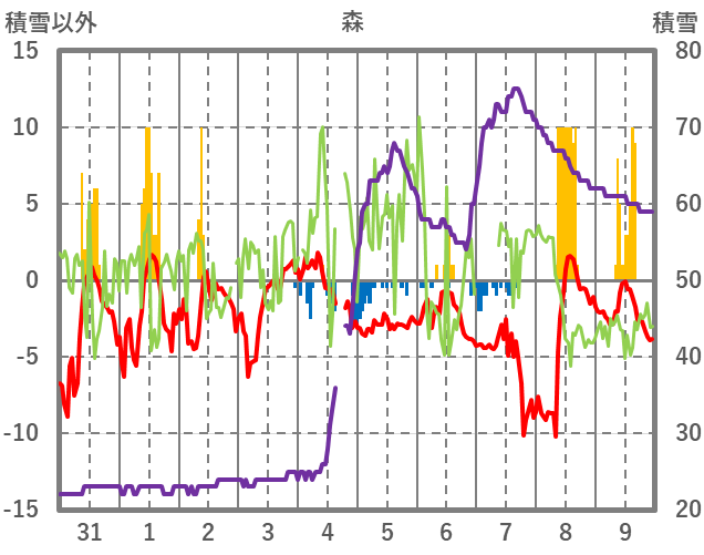 | 日 | 時 | 気温 | 降水 | 風向/風速 | 日照 | 積雪 | 降雪 |