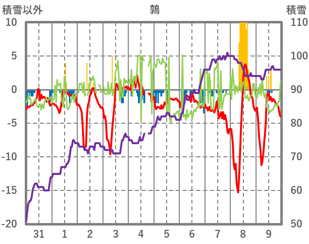 | 日 | 時 | 気温 | 降水 | 風向/風速 | 日照 | 積雪 | 降雪 |