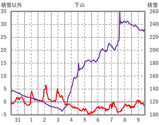 | 日 | 時 | 気温 | 降水 | 風向/風速 | 日照 | 積雪 | 降雪 |