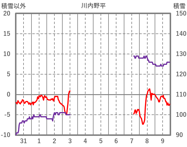 | 日 | 時 | 気温 | 降水 | 風向/風速 | 日照 | 積雪 | 降雪 |