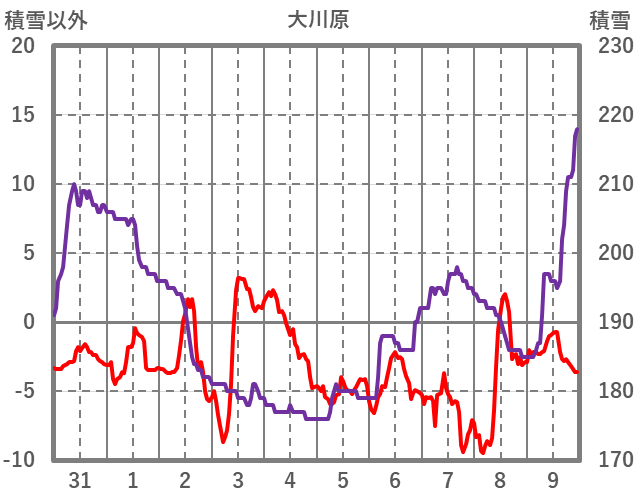 | 日 | 時 | 気温 | 降水 | 風向/風速 | 日照 | 積雪 | 降雪 |