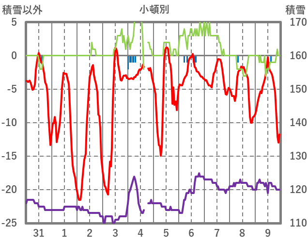 | 日 | 時 | 気温 | 降水 | 風向/風速 | 日照 | 積雪 | 降雪 |