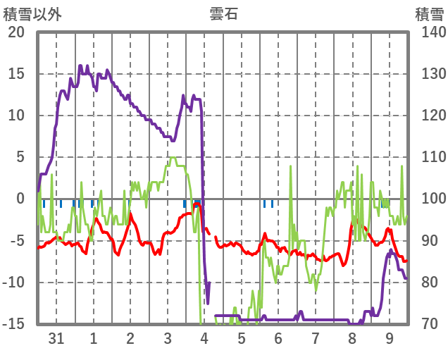| 日 | 時 | 気温 | 降水 | 風向/風速 | 日照 | 積雪 | 降雪 |