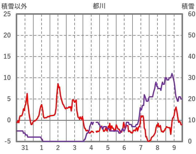 | 日 | 時 | 気温 | 降水 | 風向/風速 | 日照 | 積雪 | 降雪 |