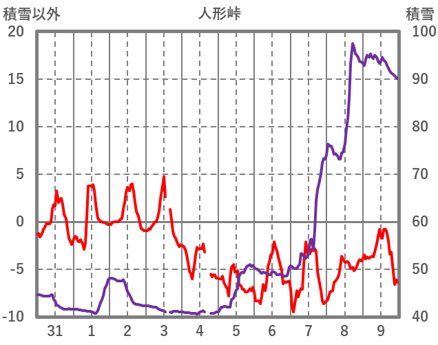 | 日 | 時 | 気温 | 降水 | 風向/風速 | 日照 | 積雪 | 降雪 |