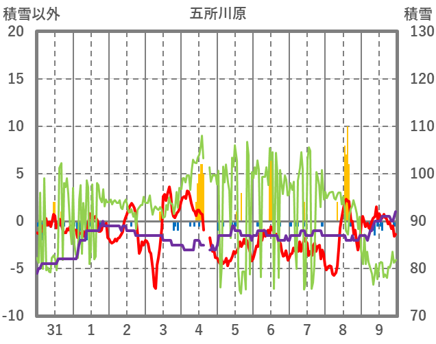 | 日 | 時 | 気温 | 降水 | 風向/風速 | 日照 | 積雪 | 降雪 |