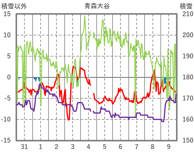 | 日 | 時 | 気温 | 降水 | 風向/風速 | 日照 | 積雪 | 降雪 |