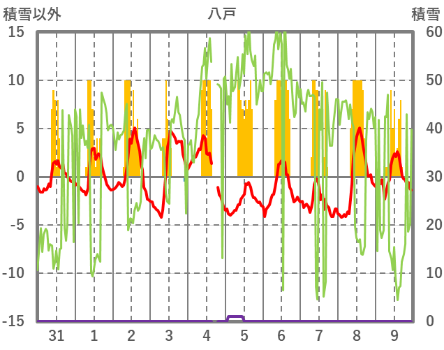 | 日 | 時 | 気温 | 降水 | 風向/風速 | 日照 | 積雪 | 降雪 |