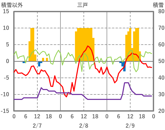 | 日 | 時 | 気温 | 降水 | 風向/風速 | 日照 | 積雪 | 降雪 |