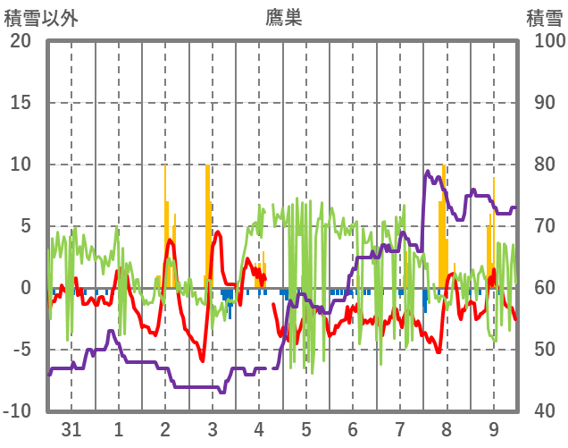 | 日 | 時 | 気温 | 降水 | 風向/風速 | 日照 | 積雪 | 降雪 |