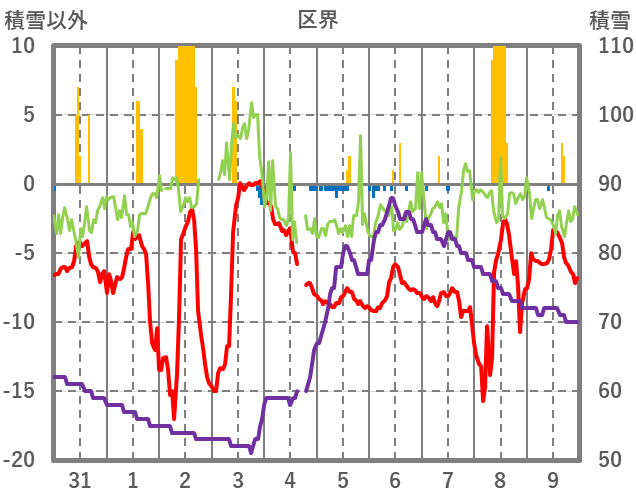| 日 | 時 | 気温 | 降水 | 風向/風速 | 日照 | 積雪 | 降雪 |