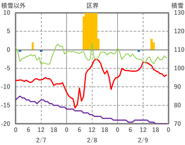 | 日 | 時 | 気温 | 降水 | 風向/風速 | 日照 | 積雪 | 降雪 |
