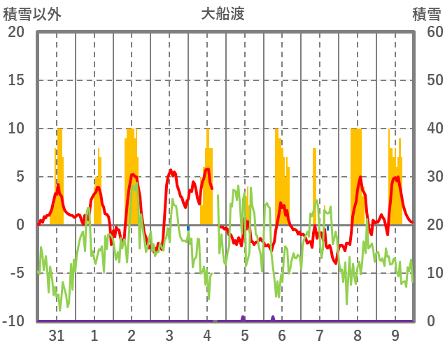 | 日 | 時 | 気温 | 降水 | 風向/風速 | 日照 | 積雪 | 降雪 |