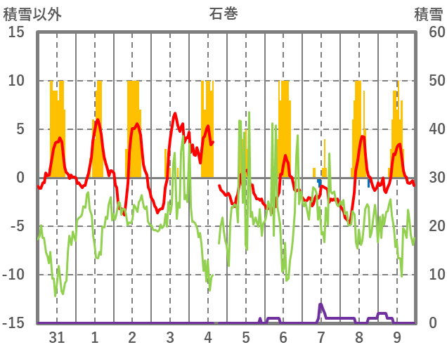 | 日 | 時 | 気温 | 降水 | 風向/風速 | 日照 | 積雪 | 降雪 |